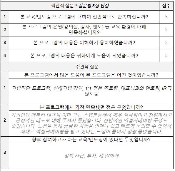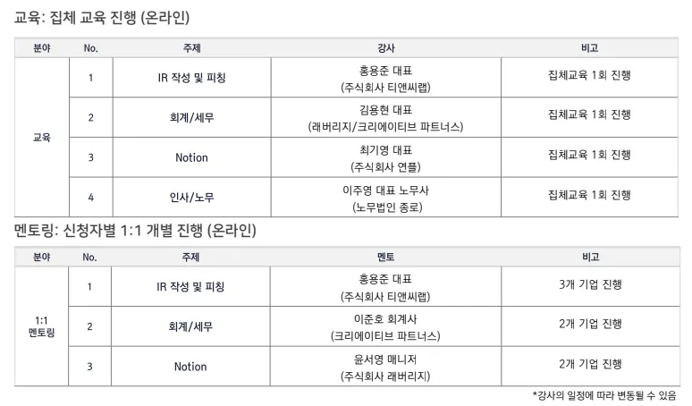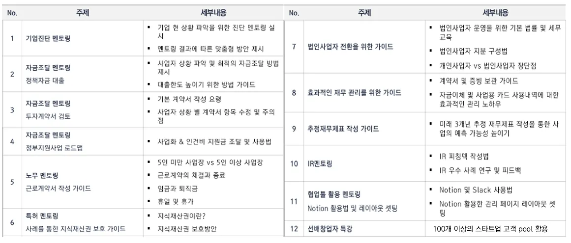 전문 분야 멘토링 | 회계·세무/노무/법률/지재권/자금조달/기업 인증/정부지원 사업 등 |
