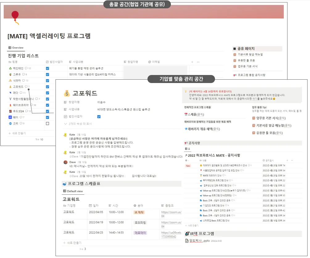 협업 기관: 전체적인 프로그램 진행 상황, 기업과의 대화 내용, 자료를 실시간으로 확인할 수 있습니다.