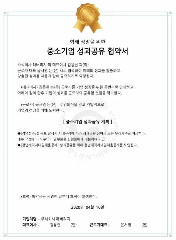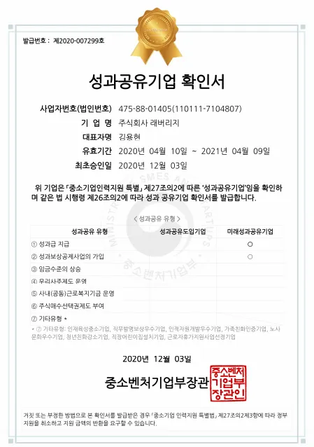 2020 | 04 | 미래성과 공유제 인증 취득 |